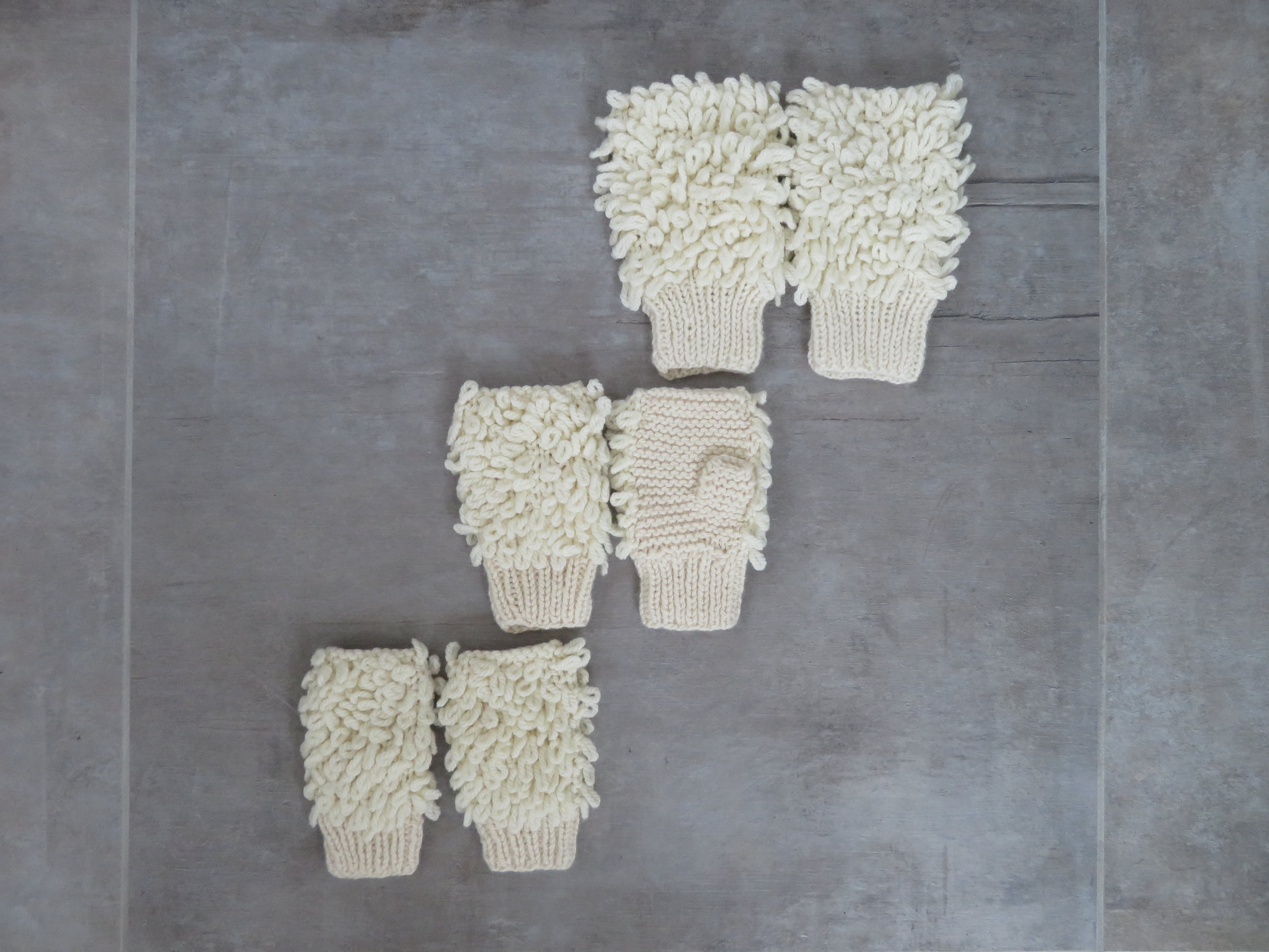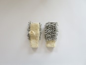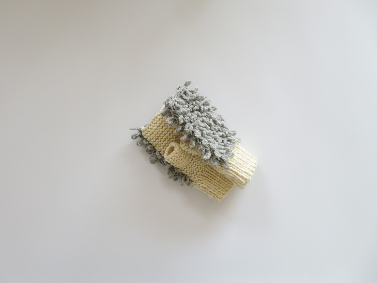 そんな平穏な光景を想像しながら編んだ「牧草とヒツジ」のシリーズ。こちらは指なしミトンのこどもサイズです。