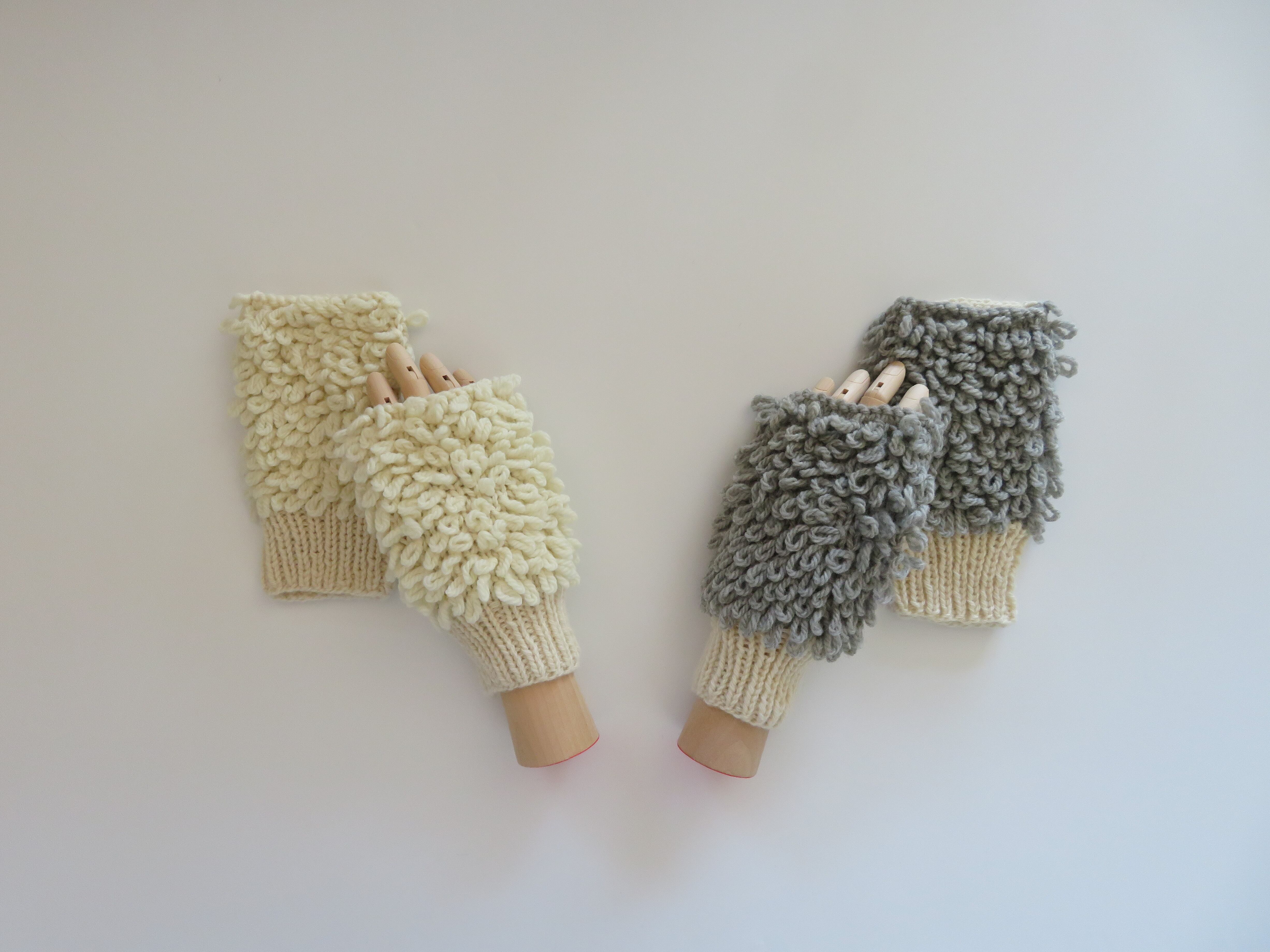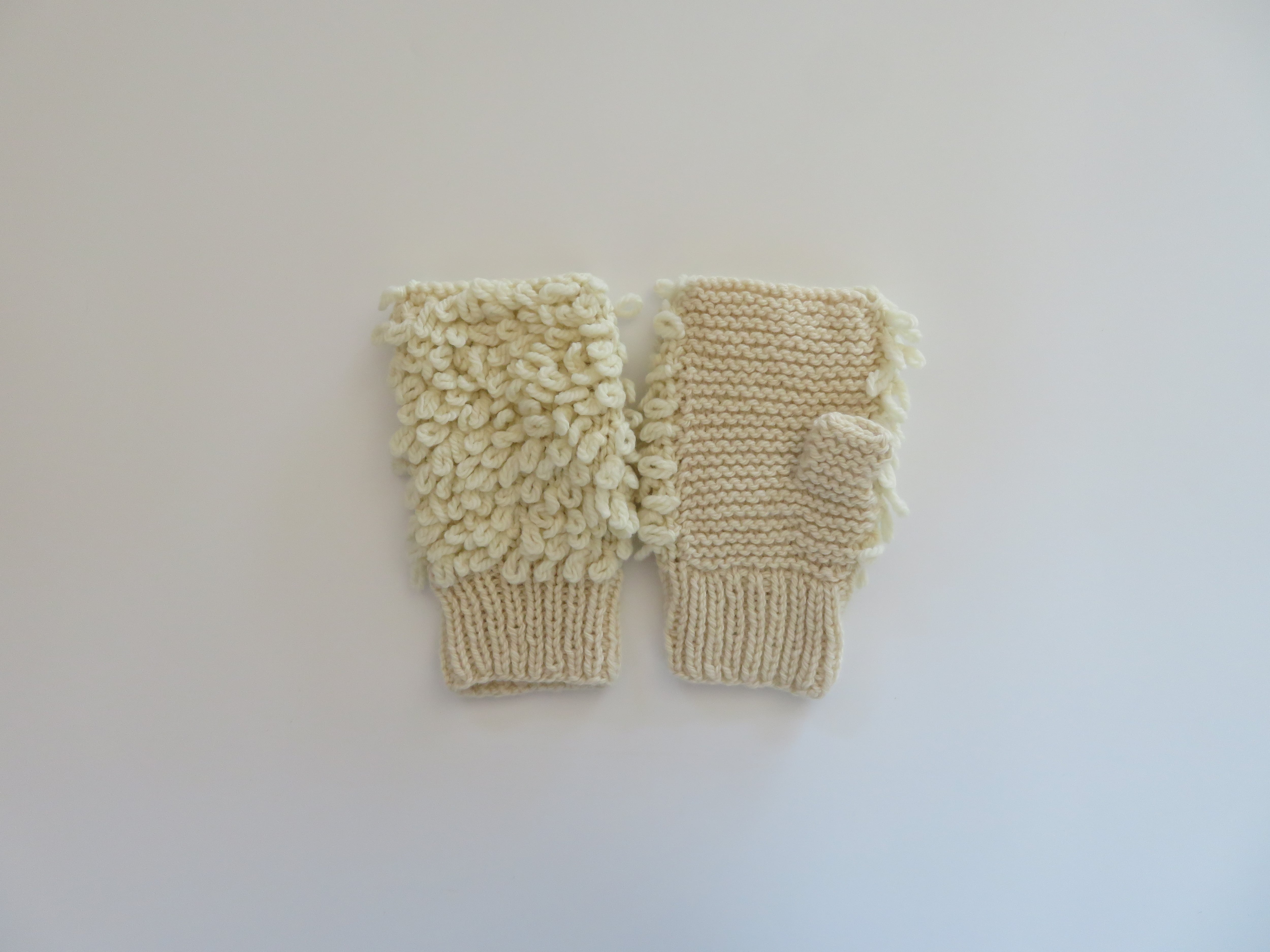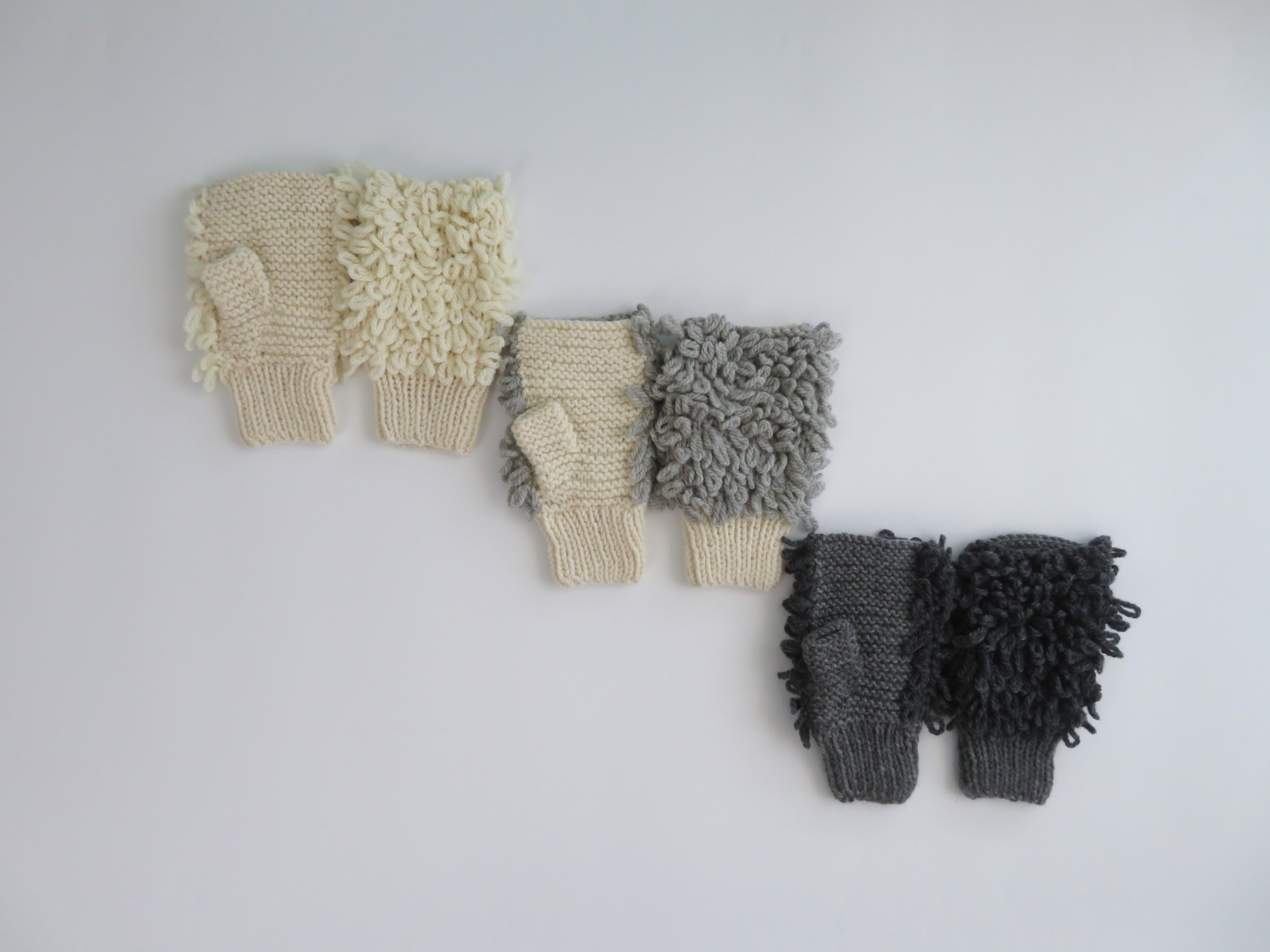 そんな平穏な光景を想像しながら編んだ「牧草とヒツジ」のシリーズ。こちらは指なしミトンのおとなサイズです。