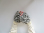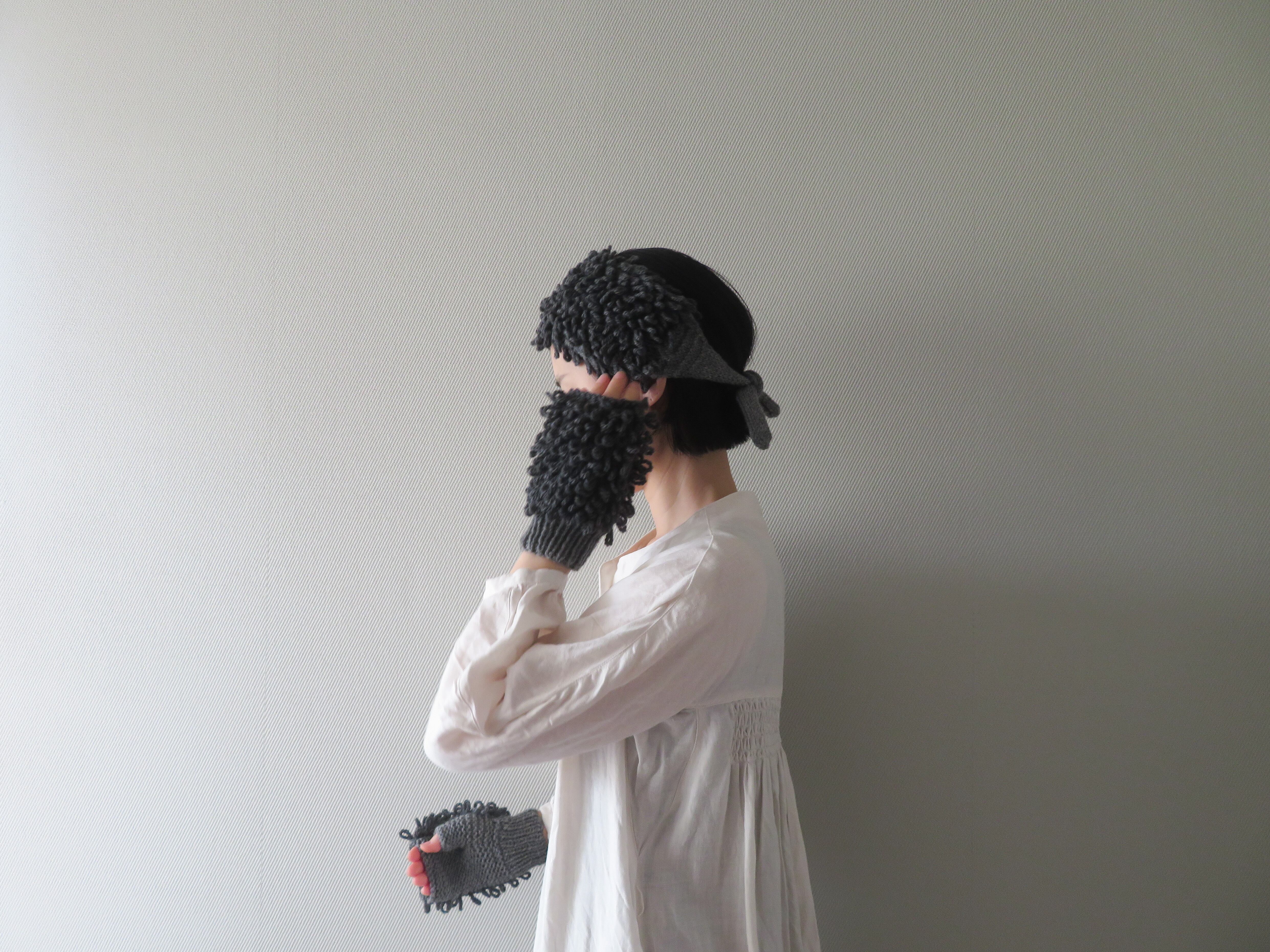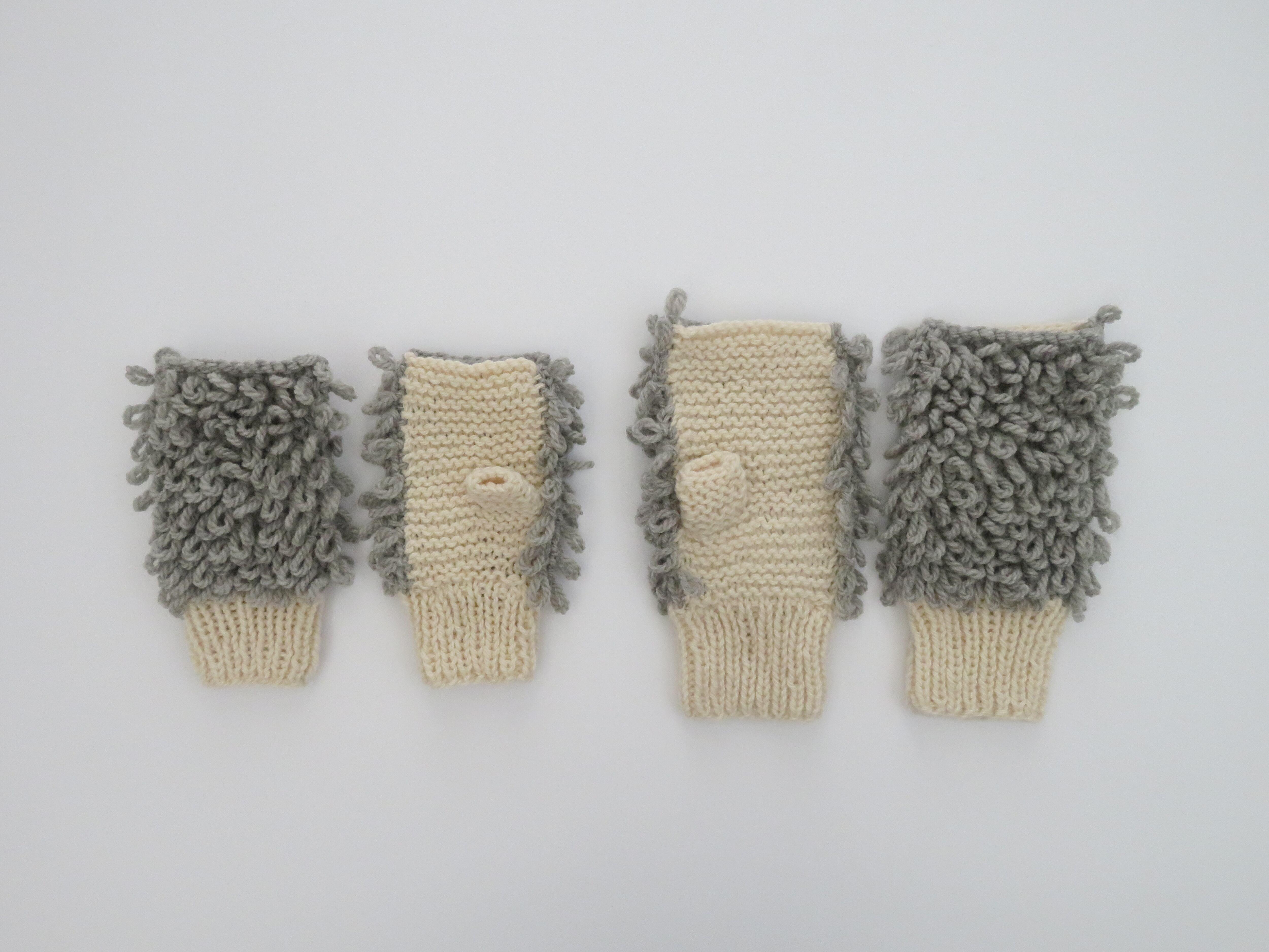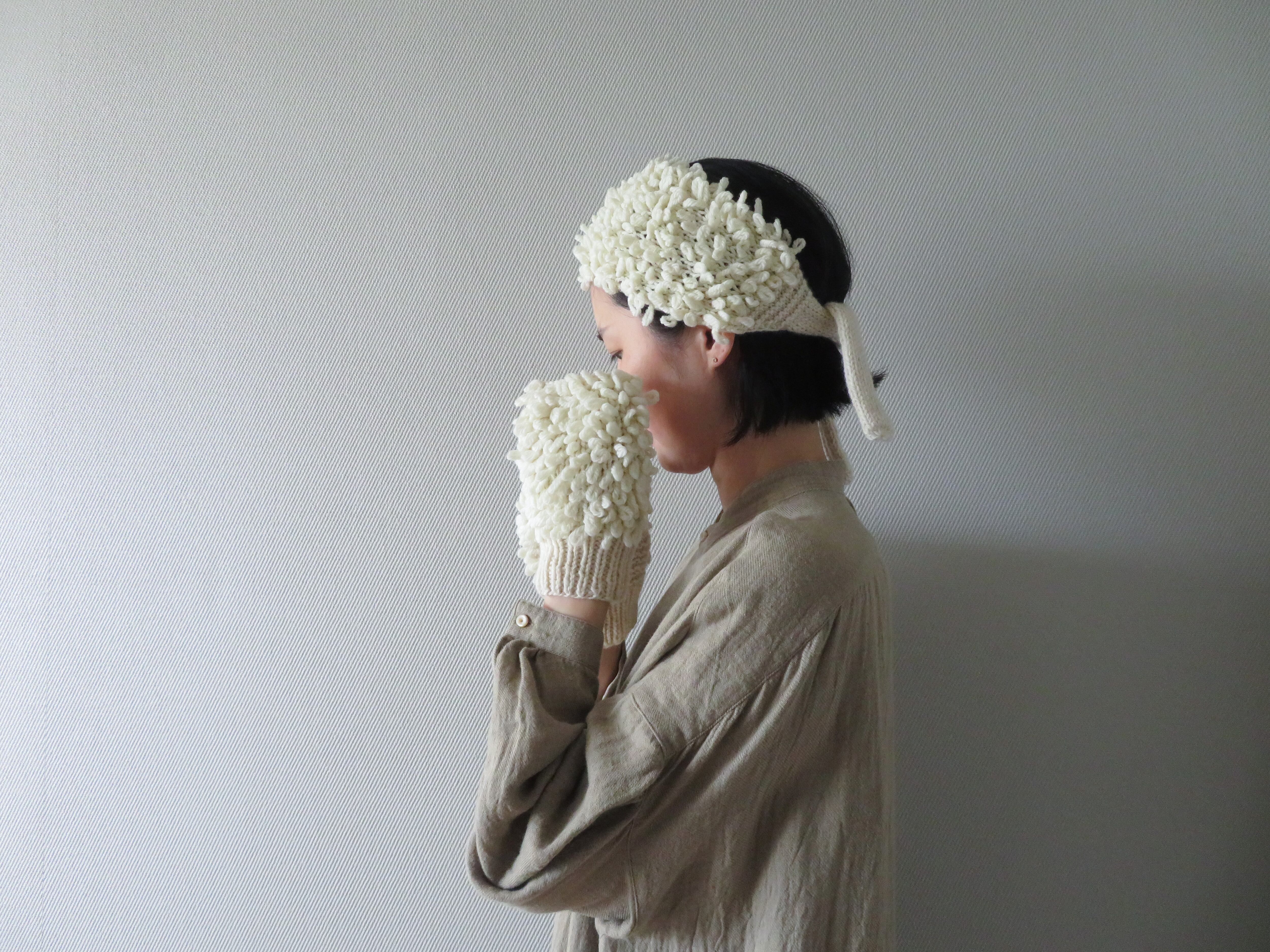 そんな平穏な光景を想像しながら編んだ「牧草とヒツジ」のシリーズ。こちらは指なしミトンのおとなサイズです。