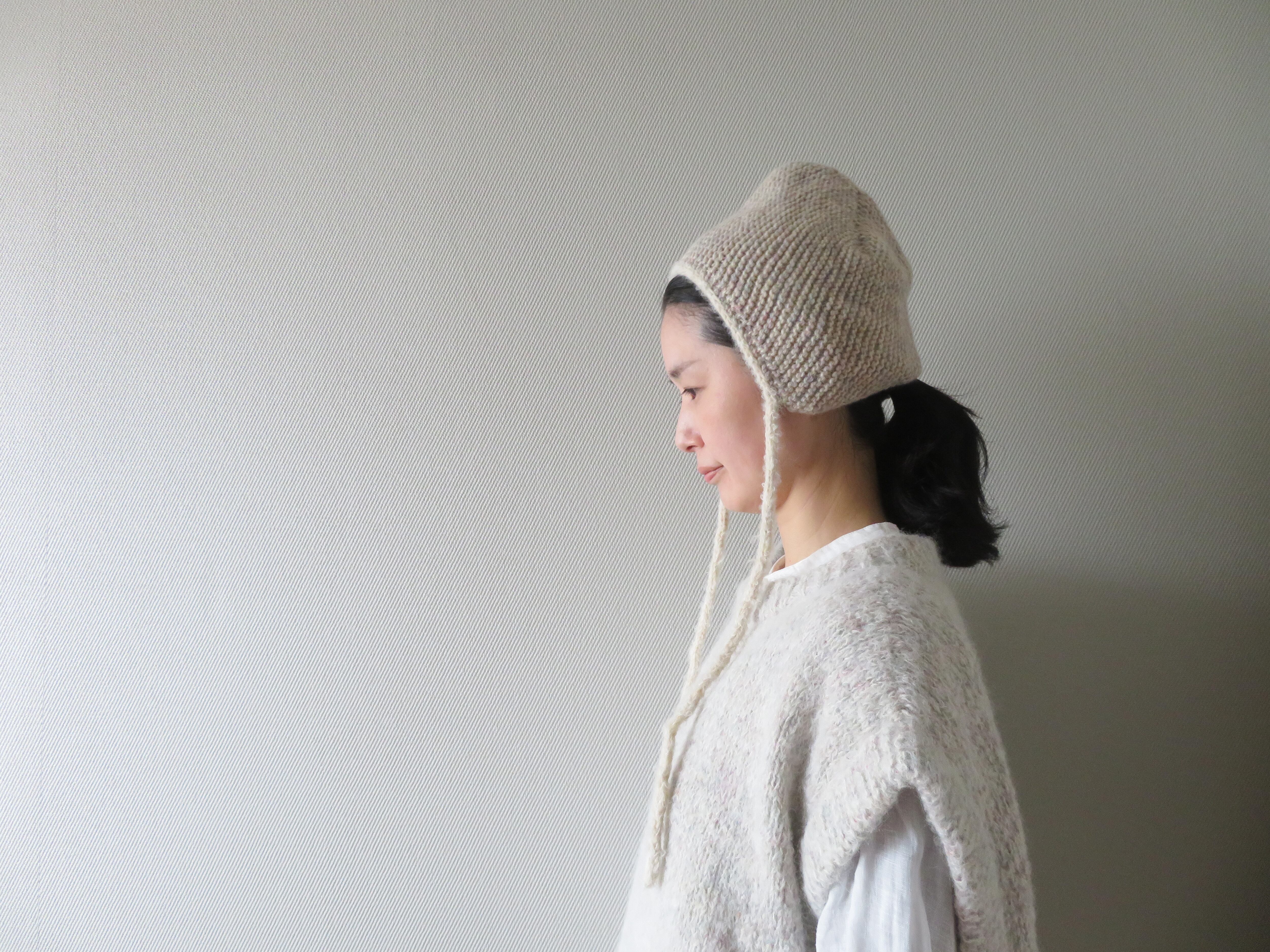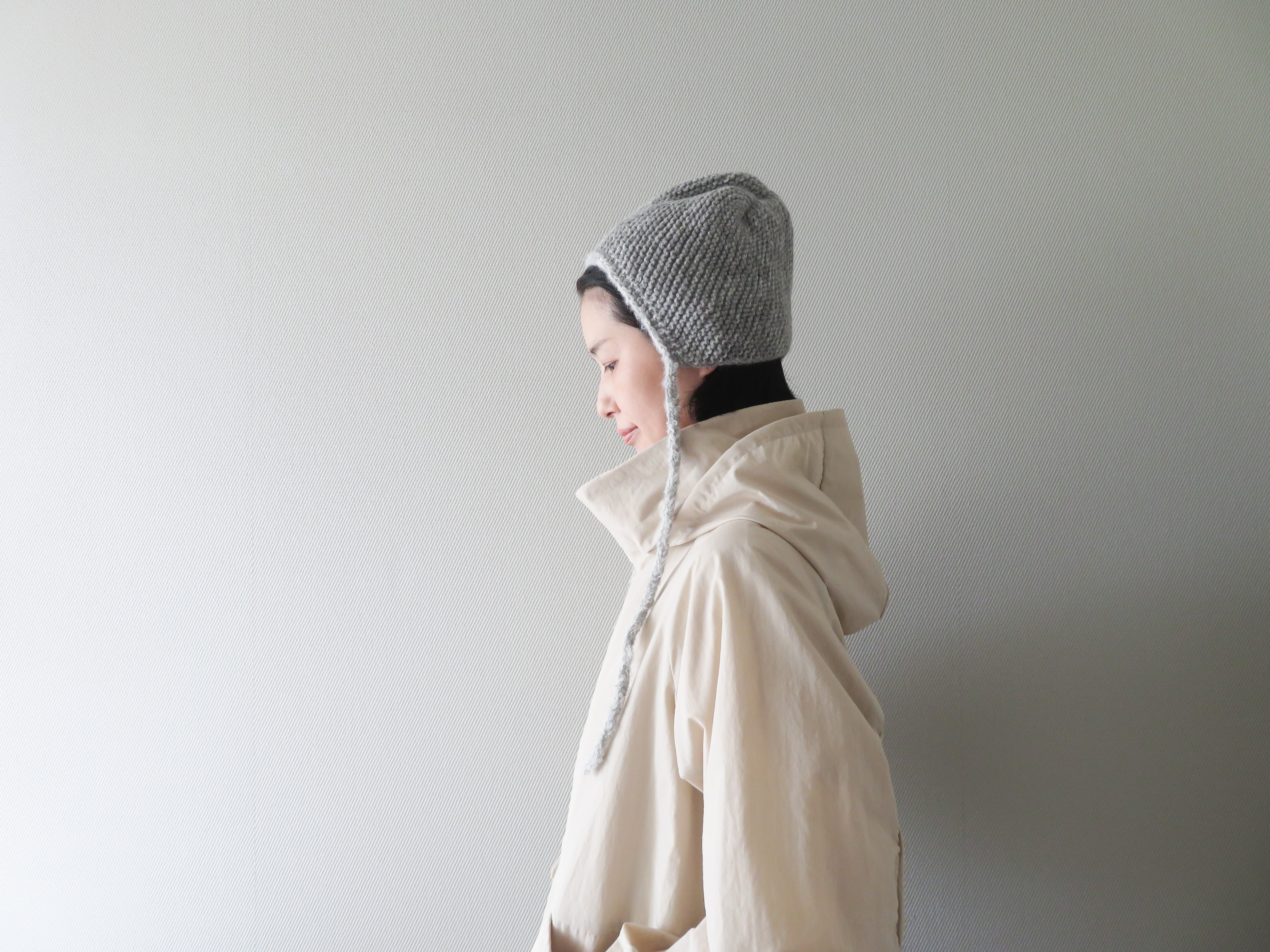 帽子・頭巾・耳当て・バラクラバ… そのどれにも似ているようで、そのどれにも当てはまらないような寒い季節のかぶりもの。展開図のような平らな編み地の端と端をはぎ組み立てることで、頭にやさしくフィットする立体的なフォルムになりました。