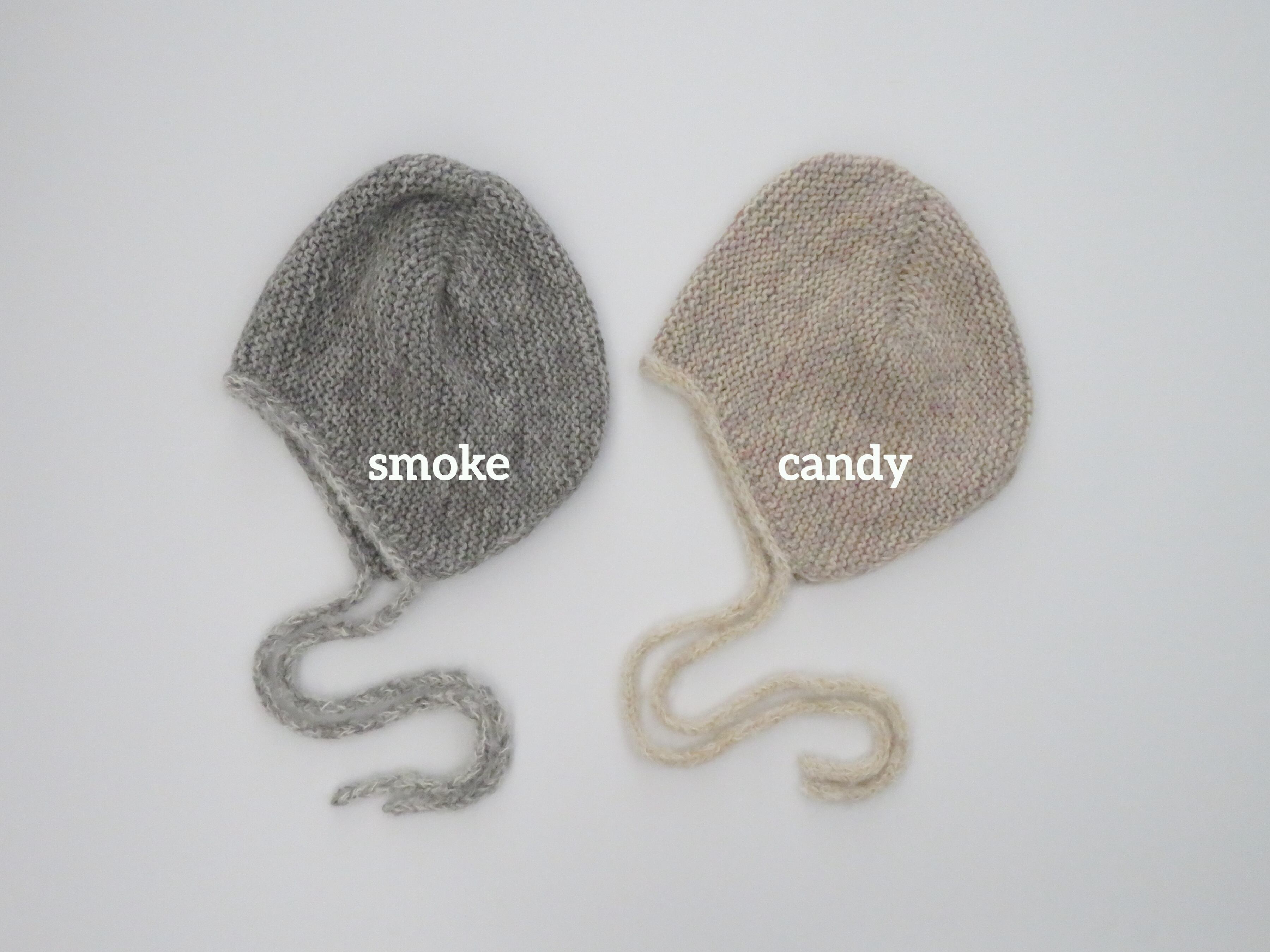寒い日にも耳まで包まれてあたたかく、木枯らしが吹く日にも飛ばされないよう、アルパカのブークレ(巻き毛)という毛糸を混ぜて編んだふわふわの紐も付いています。紐は首の前で結んだり、首のうしろで結んだり、サイドにたらしたり。