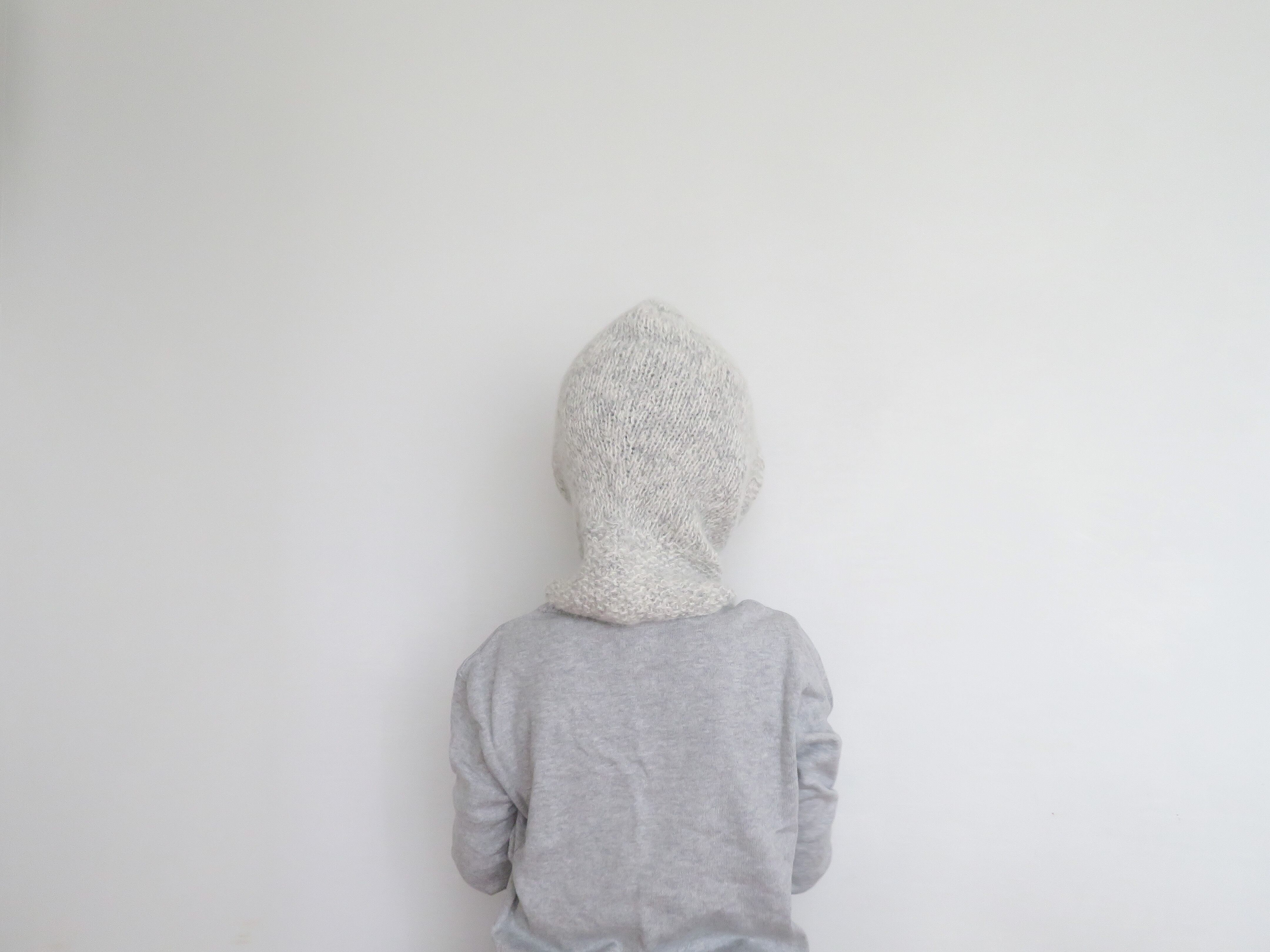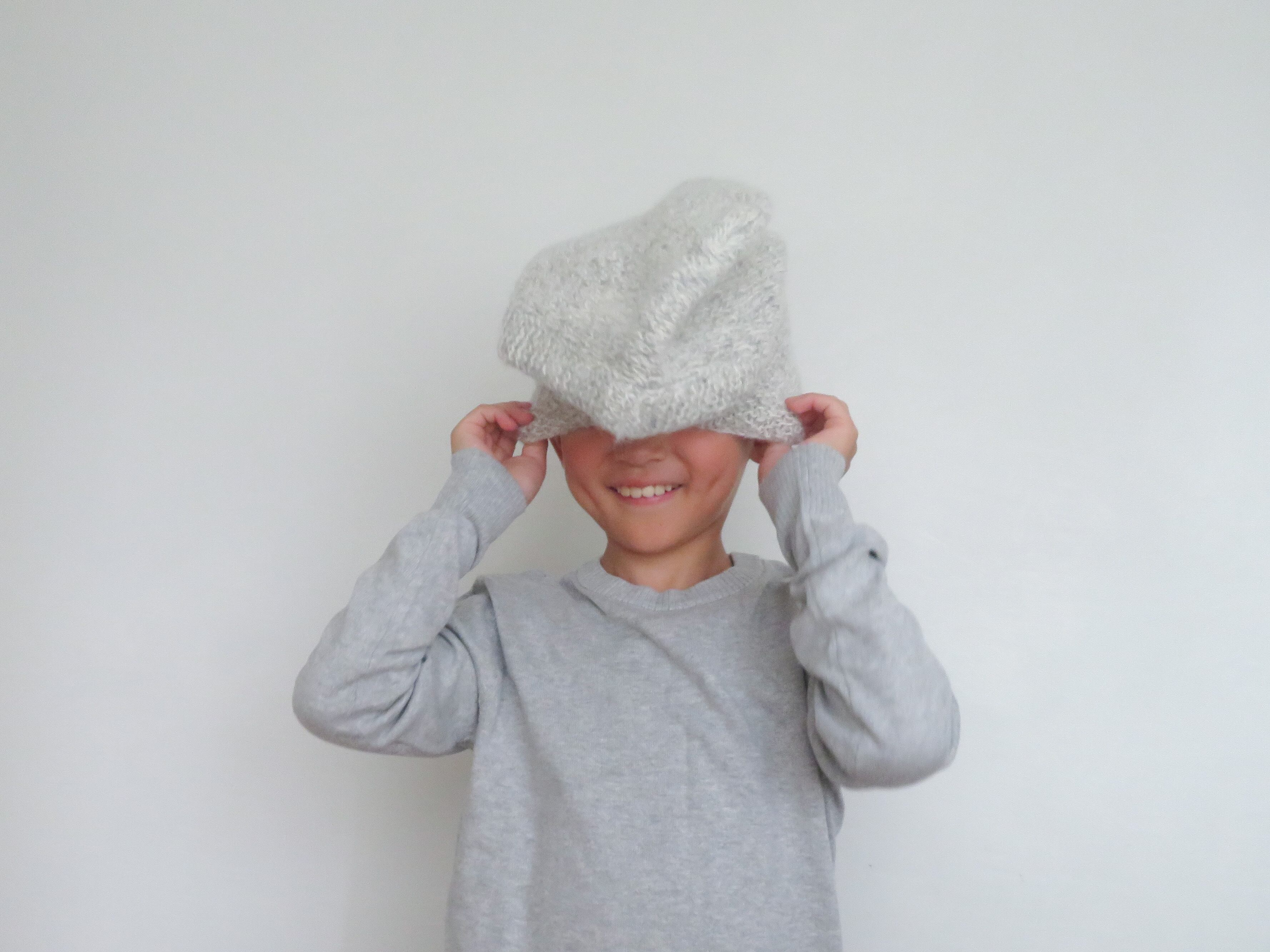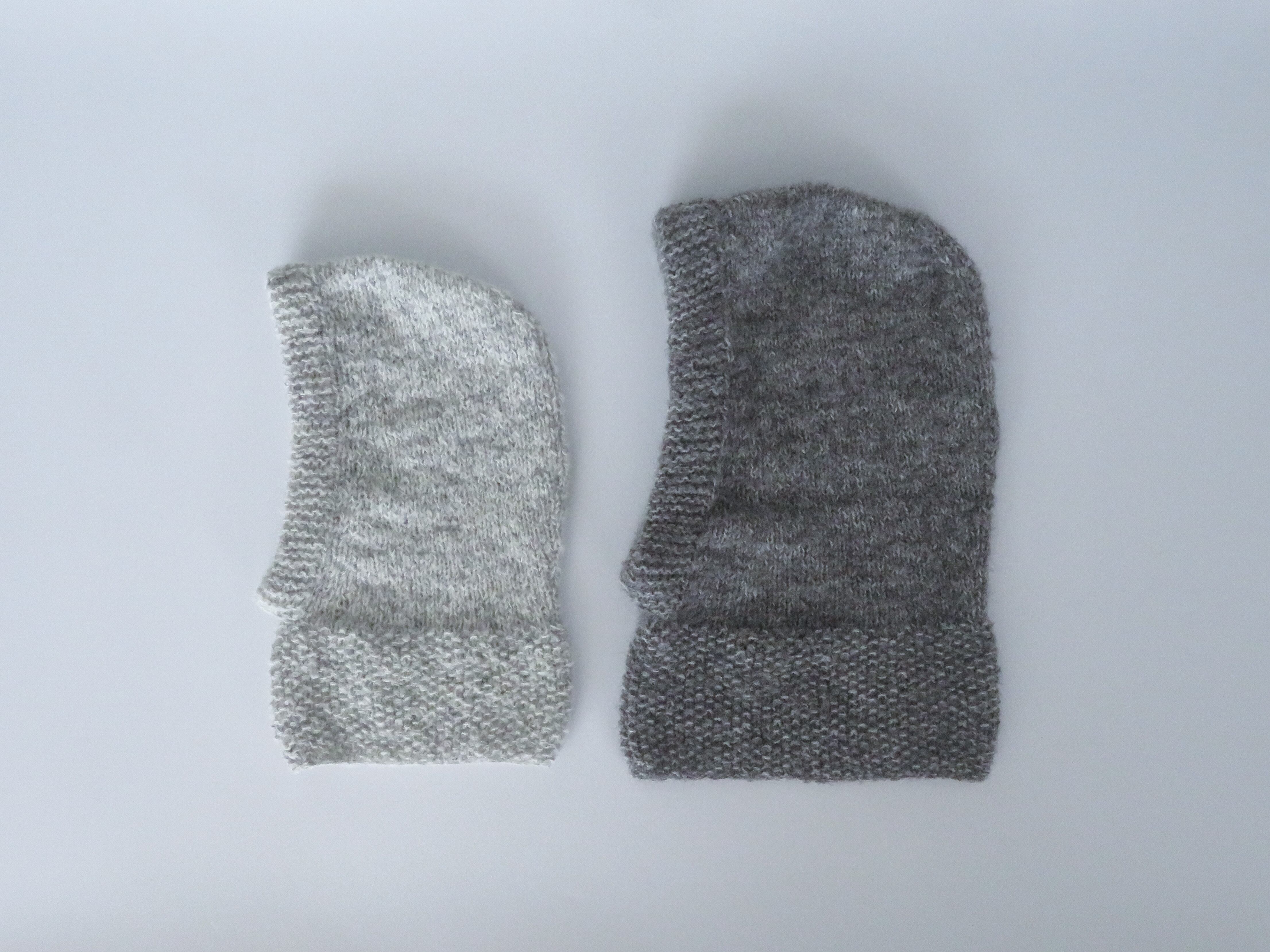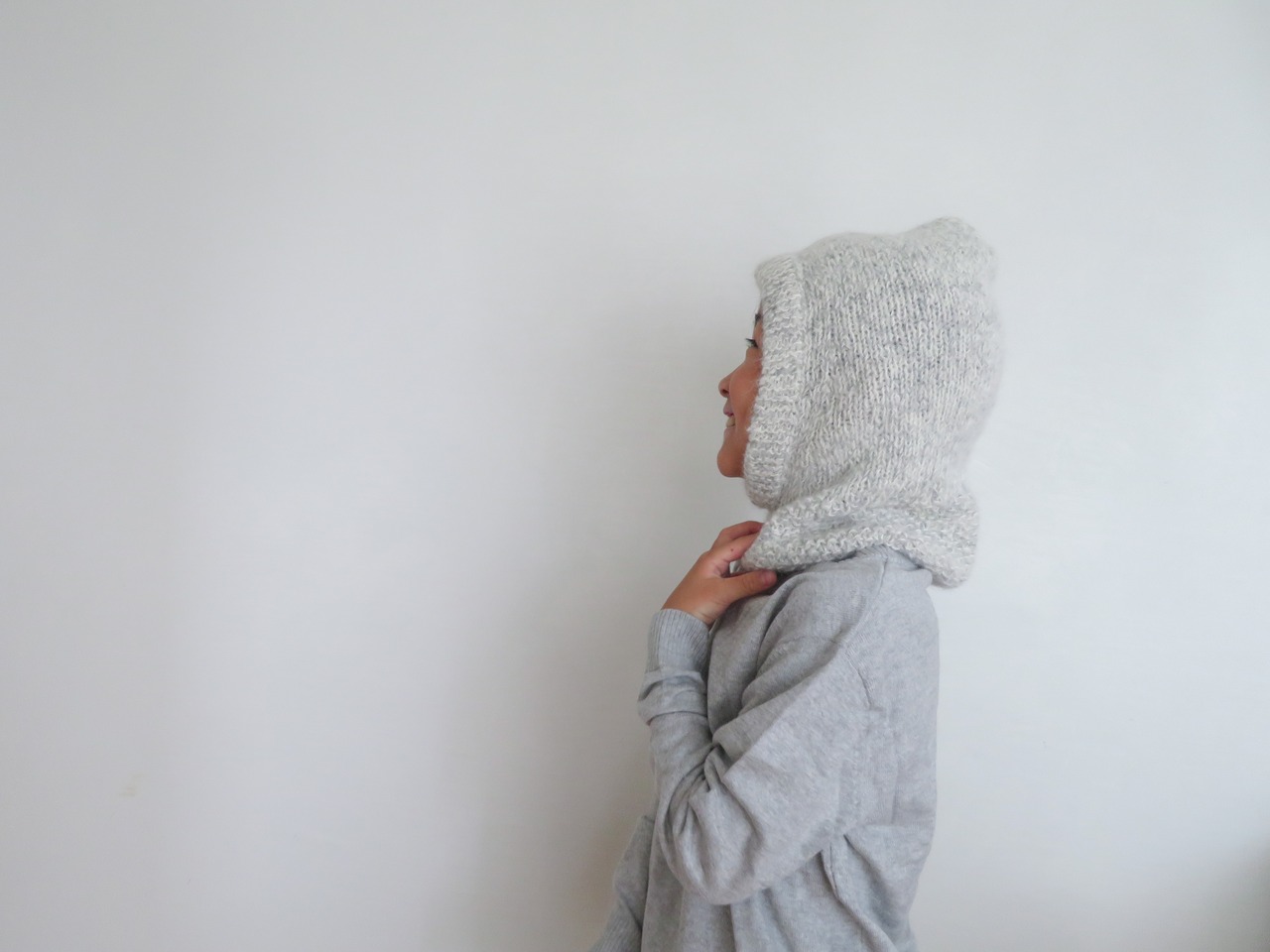 頭にすっぽりかぶることが出来る「カグール」という名前の防寒具。編み地には素朴な手ざわりのヒツジの毛と、毛足が長くやわらかなアルパカの毛を使用し、丸みを帯びたかたちはピースフルな動物たちの姿をイメージしています。
