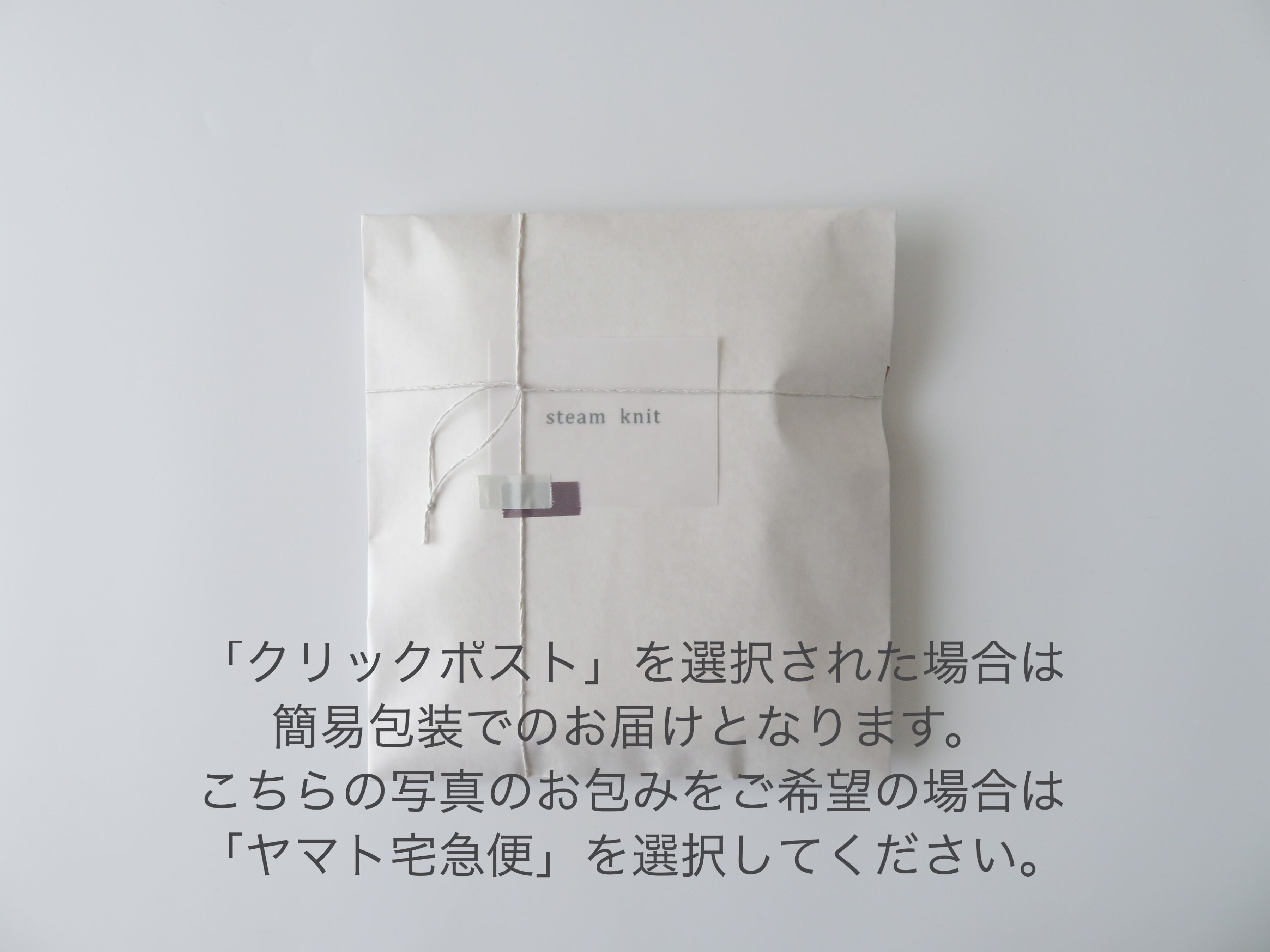 こちらの商品はサイズの都合により、配送方法に「クリックポスト(全国一律送料 250円)」を選択された場合、OPP袋を使用した簡易包装でのお届けとなります。配送方法に「ヤマト宅急便(全国一律送料 800円)」を選択された場合は、他の商品と同じく紙の袋とコットン・リネン・シルク素材などの紐でお包みしてお届けいたします。それぞれの商品ページの写真の最後にお包みした一例を掲載しております。簡単なラッピングではございますが、ギフトなどにご利用いただく場合は「ヤマト宅急便(全国一律送料 800円)」での配送をお選びいただくことをおすすめいたします。