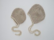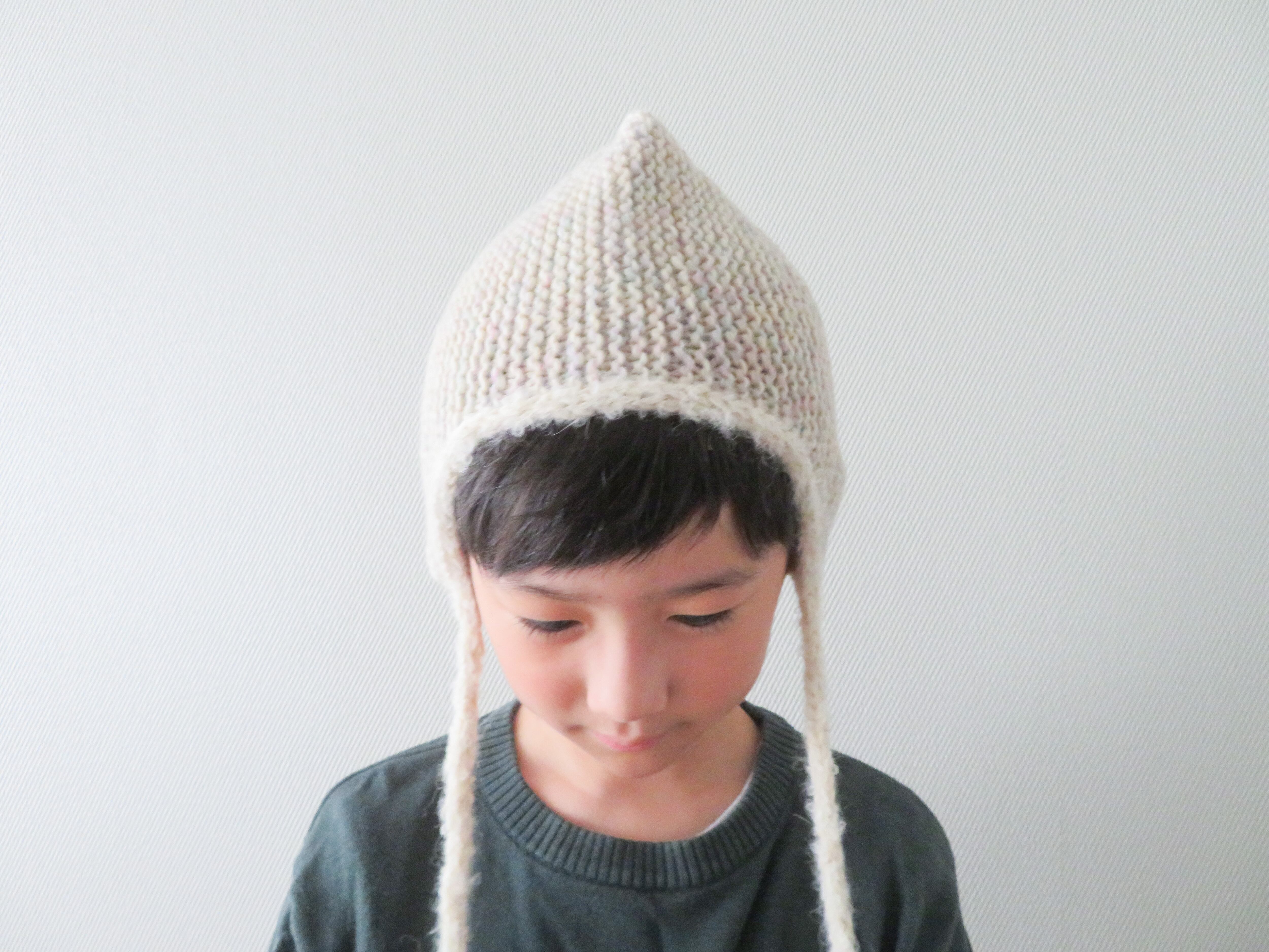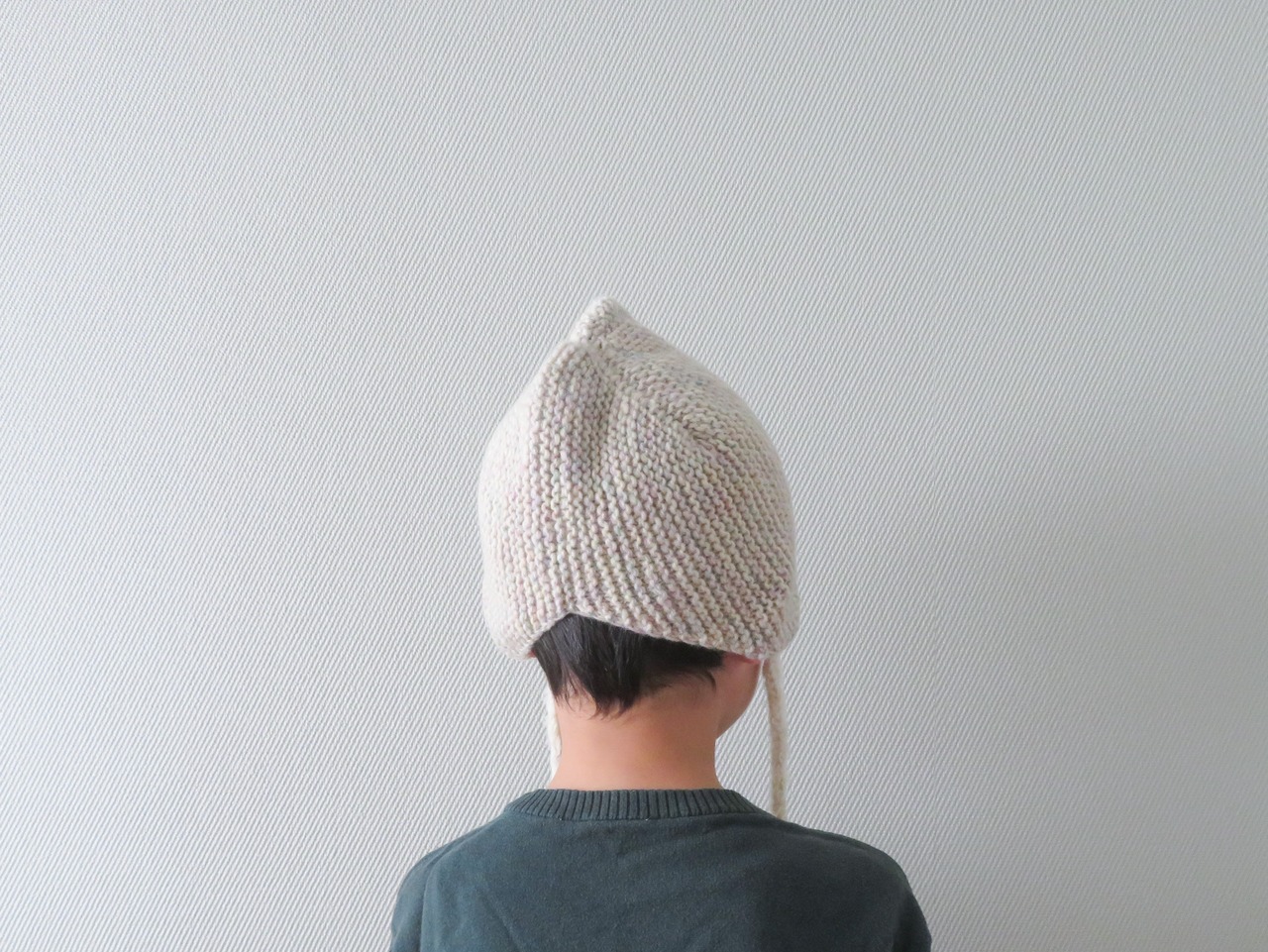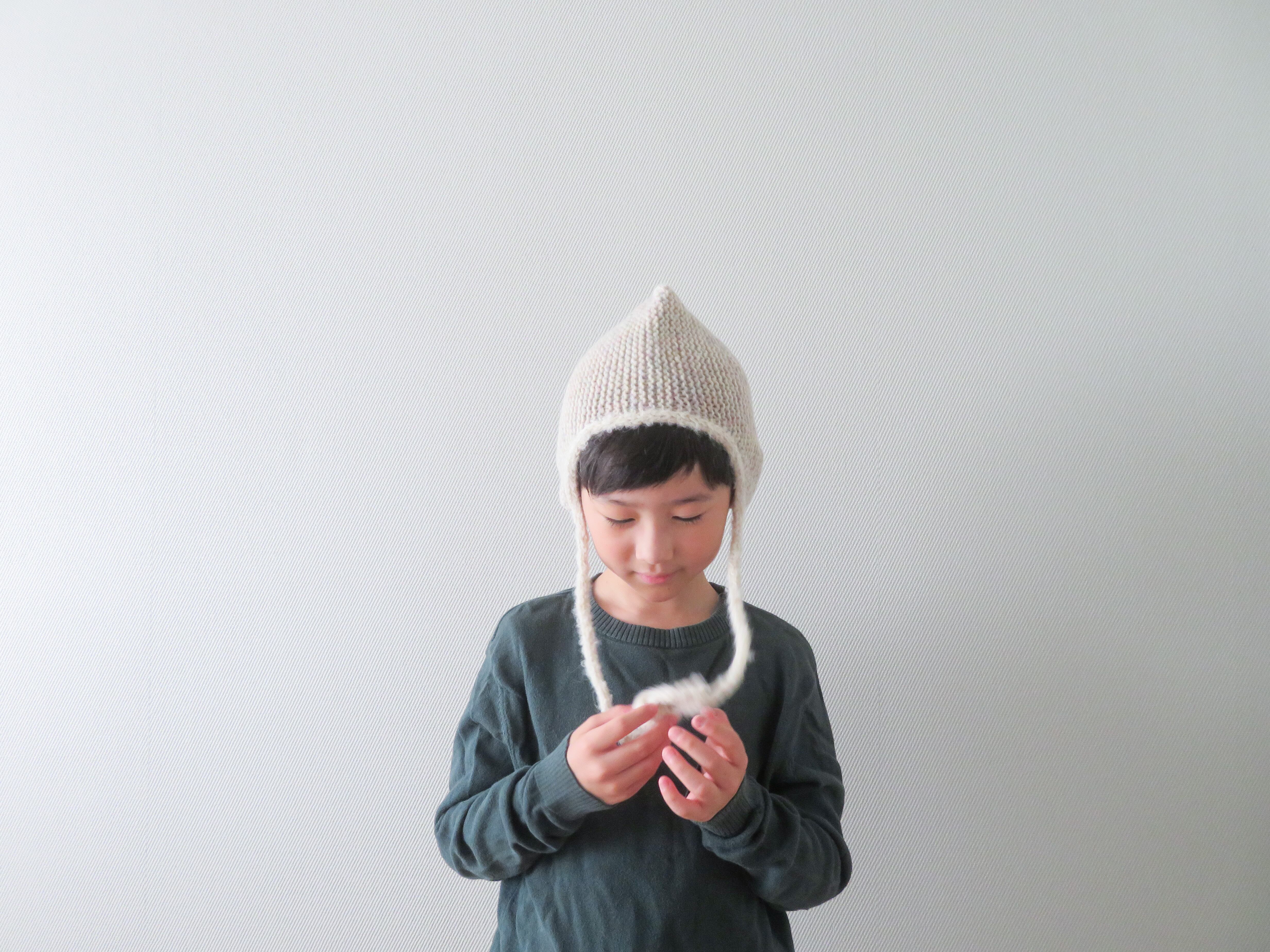 帽子・頭巾・耳当て・バラクラバ… そのどれにも似ているようで、そのどれにも当てはまらないような寒い季節のかぶりもの。展開図のような平らな編み地の端と端をはぎ組み立てることで、頭にやさしくフィットする立体的なフォルムになりました。