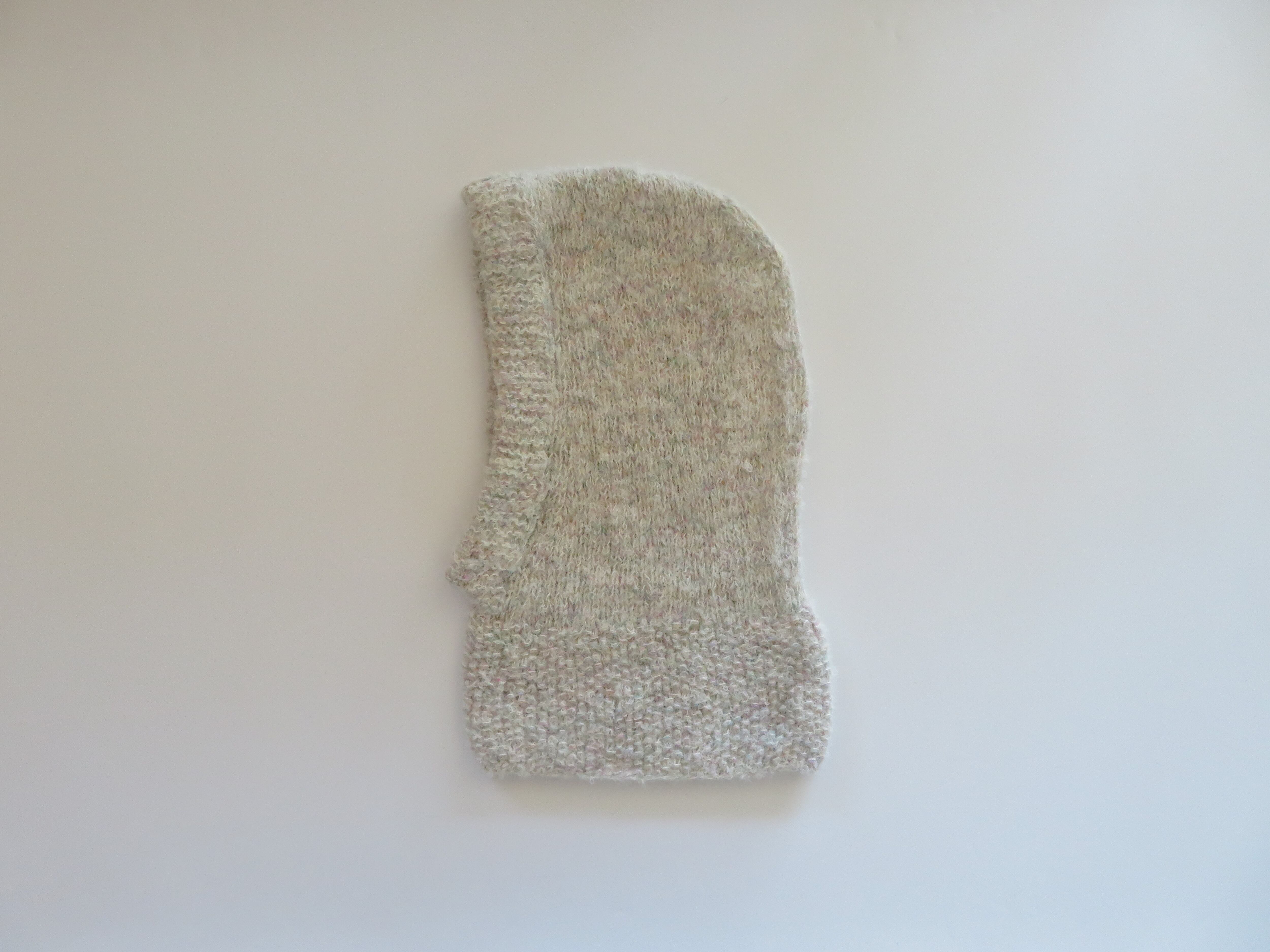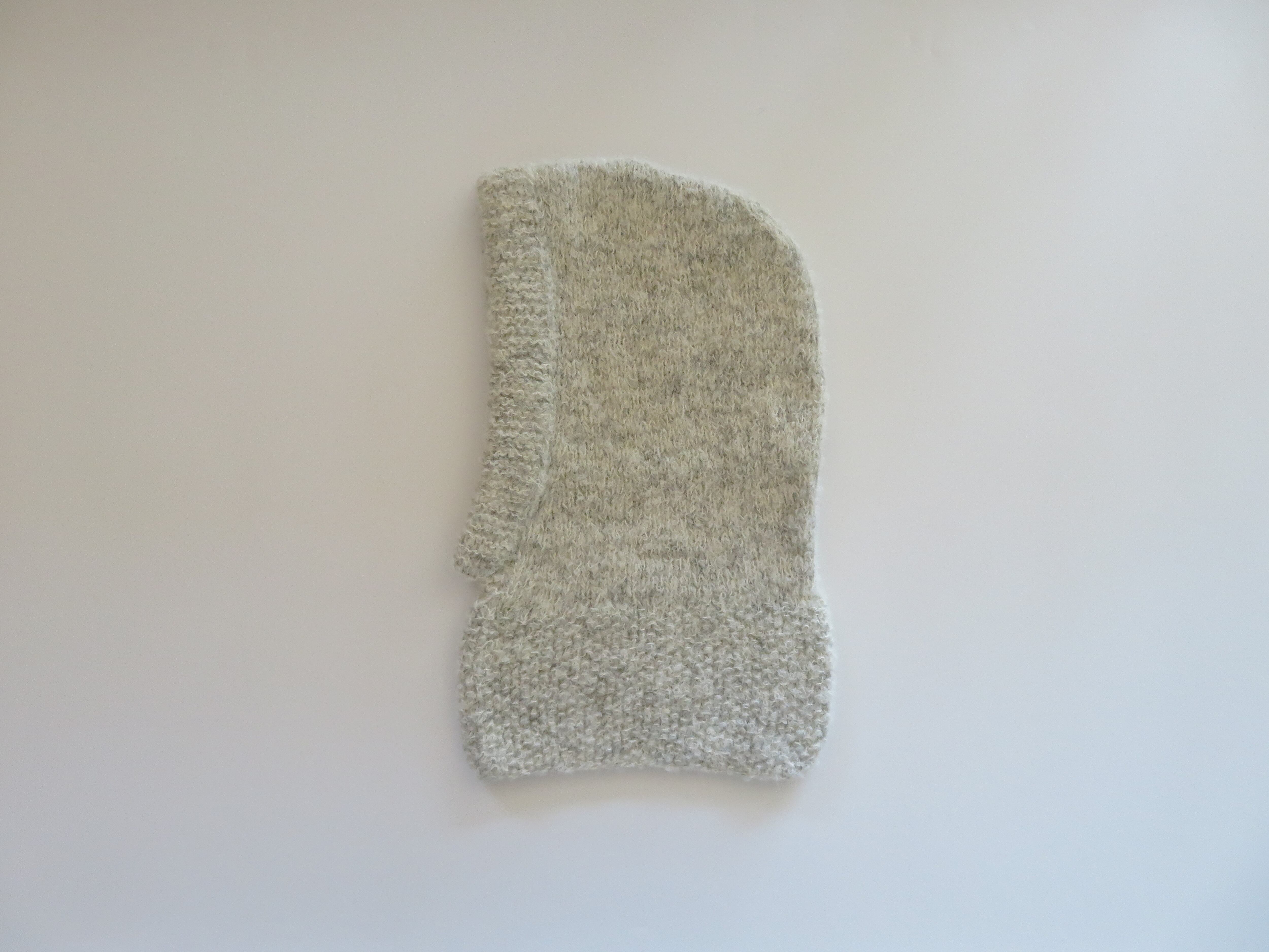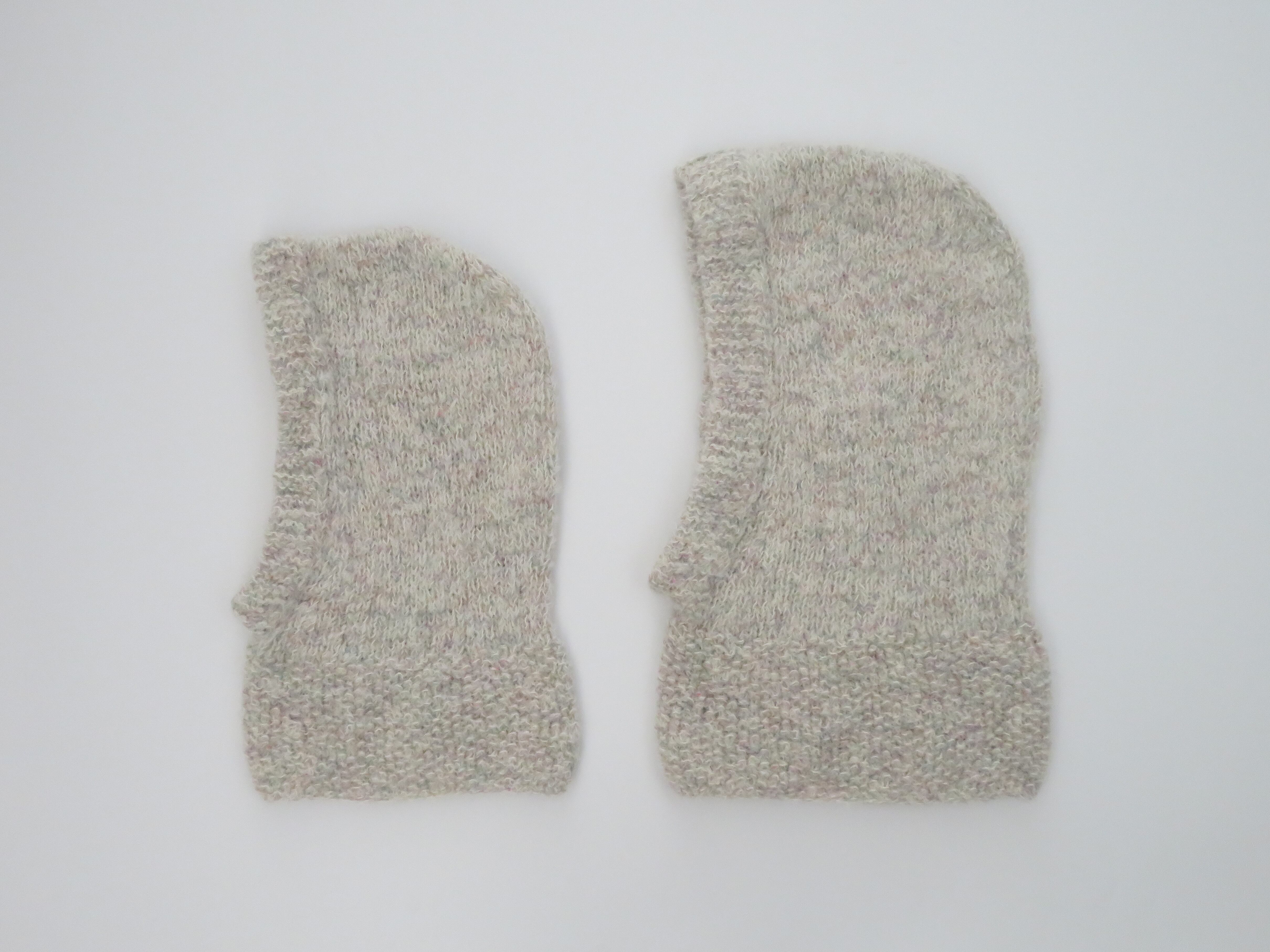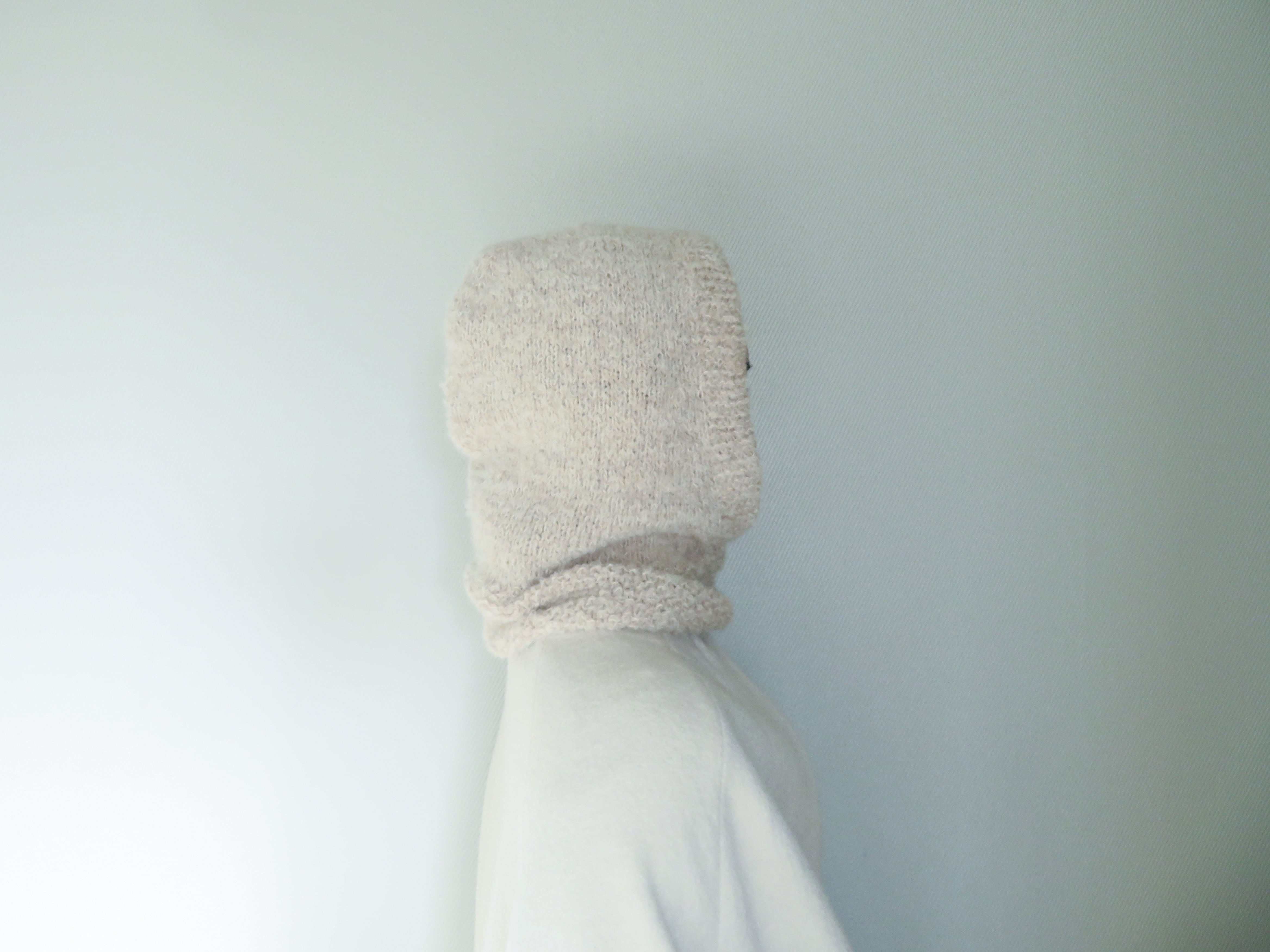 頭にすっぽりかぶることが出来る「カグール」という名前の防寒具。編み地には素朴な手ざわりのヒツジの毛と、毛足が長くやわらかなアルパカの毛を使用し、丸みを帯びたかたちはピースフルな動物たちの姿をイメージしています。